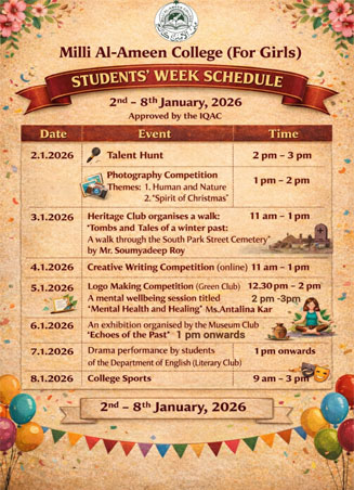 The establishment of Milli Al-Ameen College (For Girls) by the Milli Educational Organization (Registered under the West Bengal Societies Registration Act, 1961) fulfilled the long-cherished desire of the Muslims of Kolkata to have a degree college for girls belonging to educationally backward sections of the society in general. The land on which this college stands tall, was obtained from the pioneer physician and scientist, Dr. Upendranath Brahmachari, who is renowned for having invented ......Read More