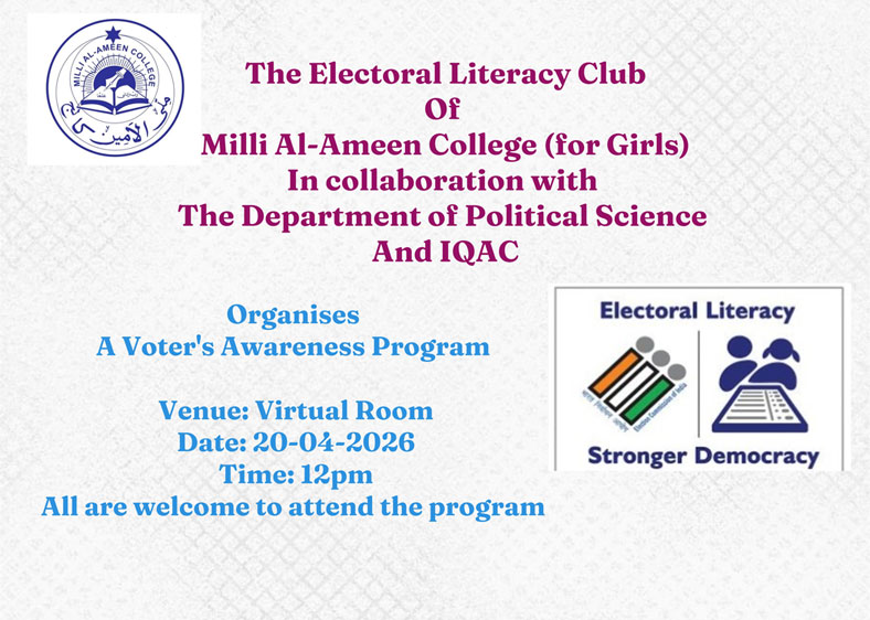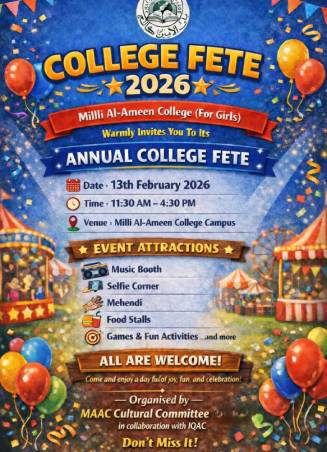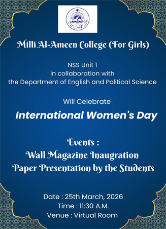 Milli Al Ameen College is committed to be an instrument of positive change in women's education for the benefit of society. In the pursuit of this mission the college undertakes :- To impart balanced education and all round development of the students, To motivate , guide and to facilitate excellence in various fields of education, To create a positive atmosphere, to facilitate creative skills, enhancing opportunities for further studies .... Read More